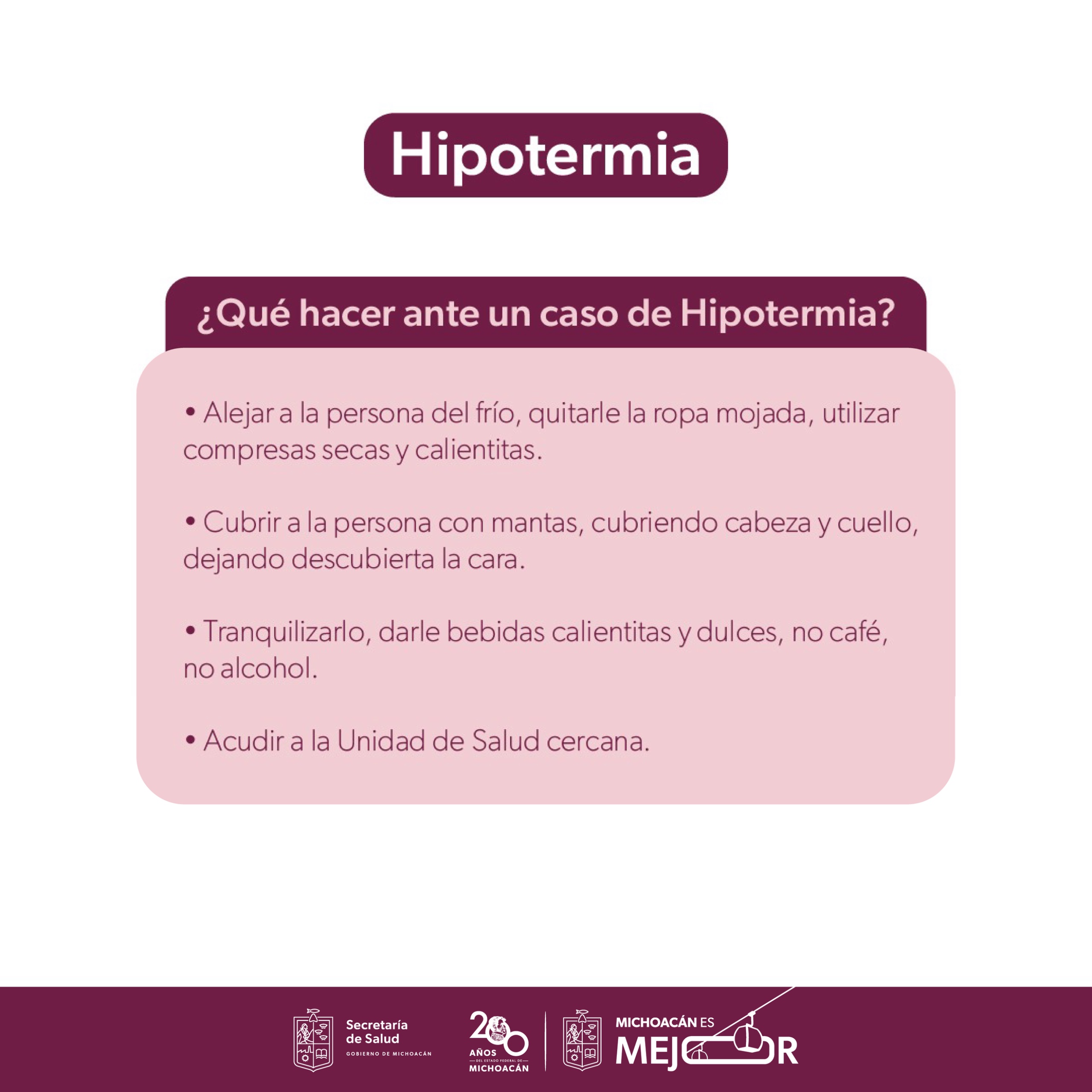 Morelia, Michoacán, 16 de diciembre de 2024.– Durante la temporada invernal incrementa el riesgo de padecer hipotermia, por ello la Secretaría de Salud de Michoacán (SSM) te dice qué hacer en caso de detectarla.