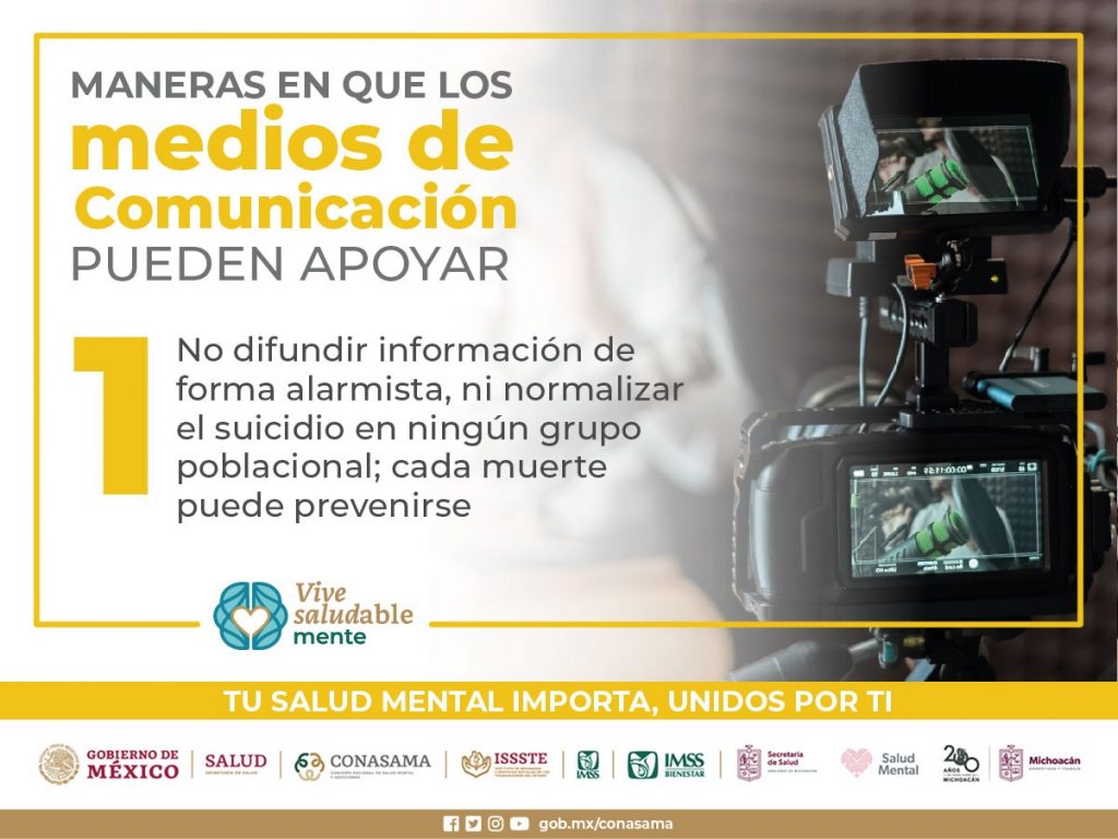 En Michoacán, las personas con comportamiento suicida pueden solicitar ayuda psicológica en 40 centros de salud, cinco Centros Comunitarios de Salud Mental y Adicciones (Cecosama) situados en Morelia, Uruapan, Zitácuaro, Lázaro Cárdenas, Uruapan y Zamora; así como la línea Hablemoos, disponible las 24 horas en los números 443 314 1617 y 443 315 9037.