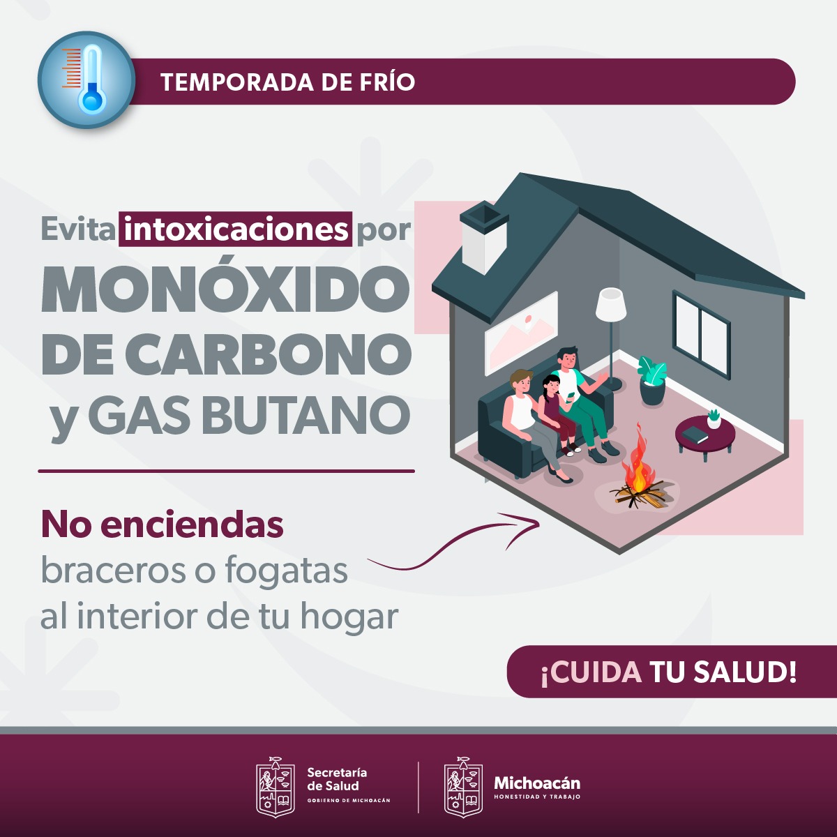 Morelia, Michoacán, 17 de diciembre de 2023.- Ante las bajas temperaturas que persisten en la entidad, la Secretaría de Salud de Michoacán (SSM) reitera el llamado a la población para que evite encender anafres, braseros o fogones en el interior del hogar, a fin de prevenir intoxicaciones por monóxido de carbono.