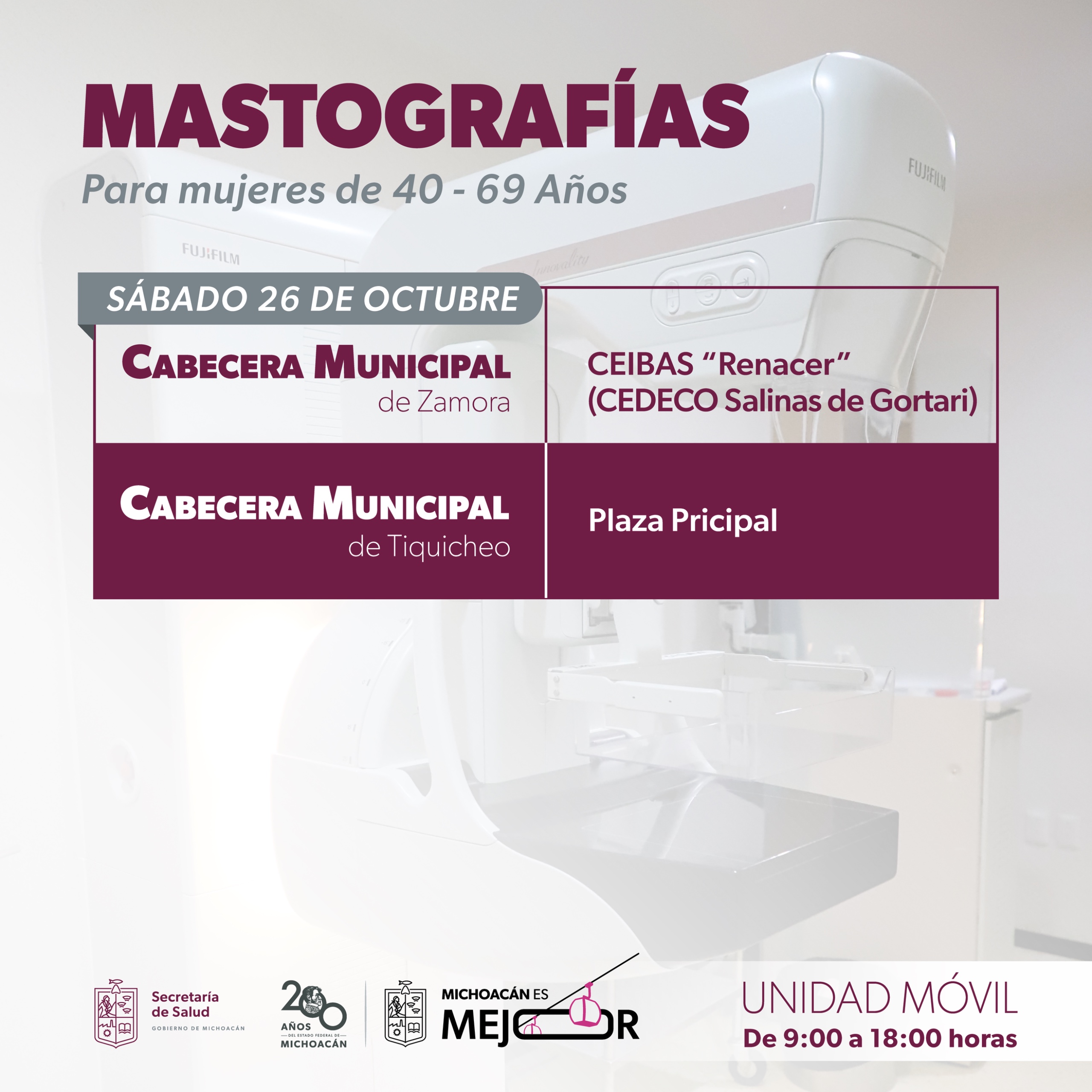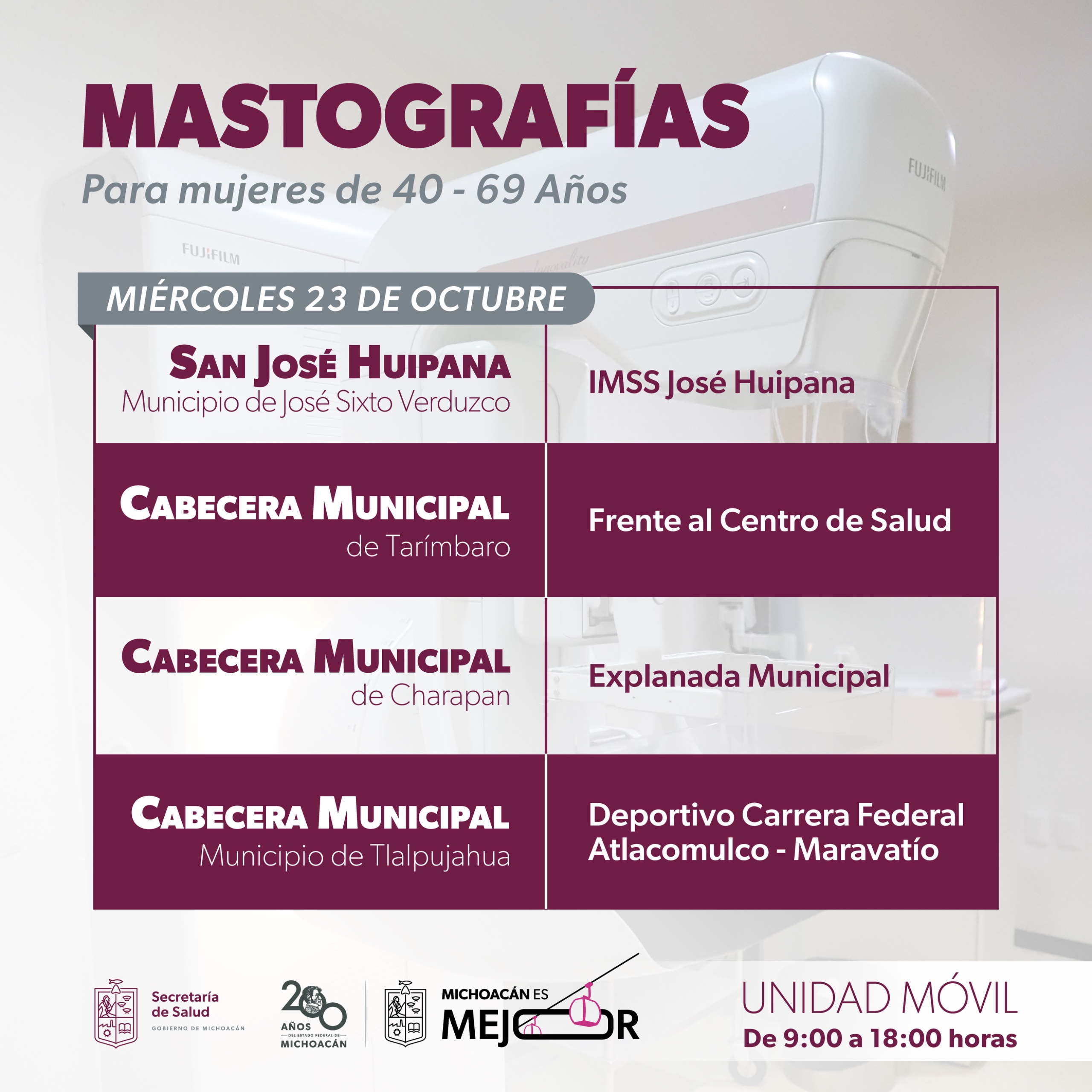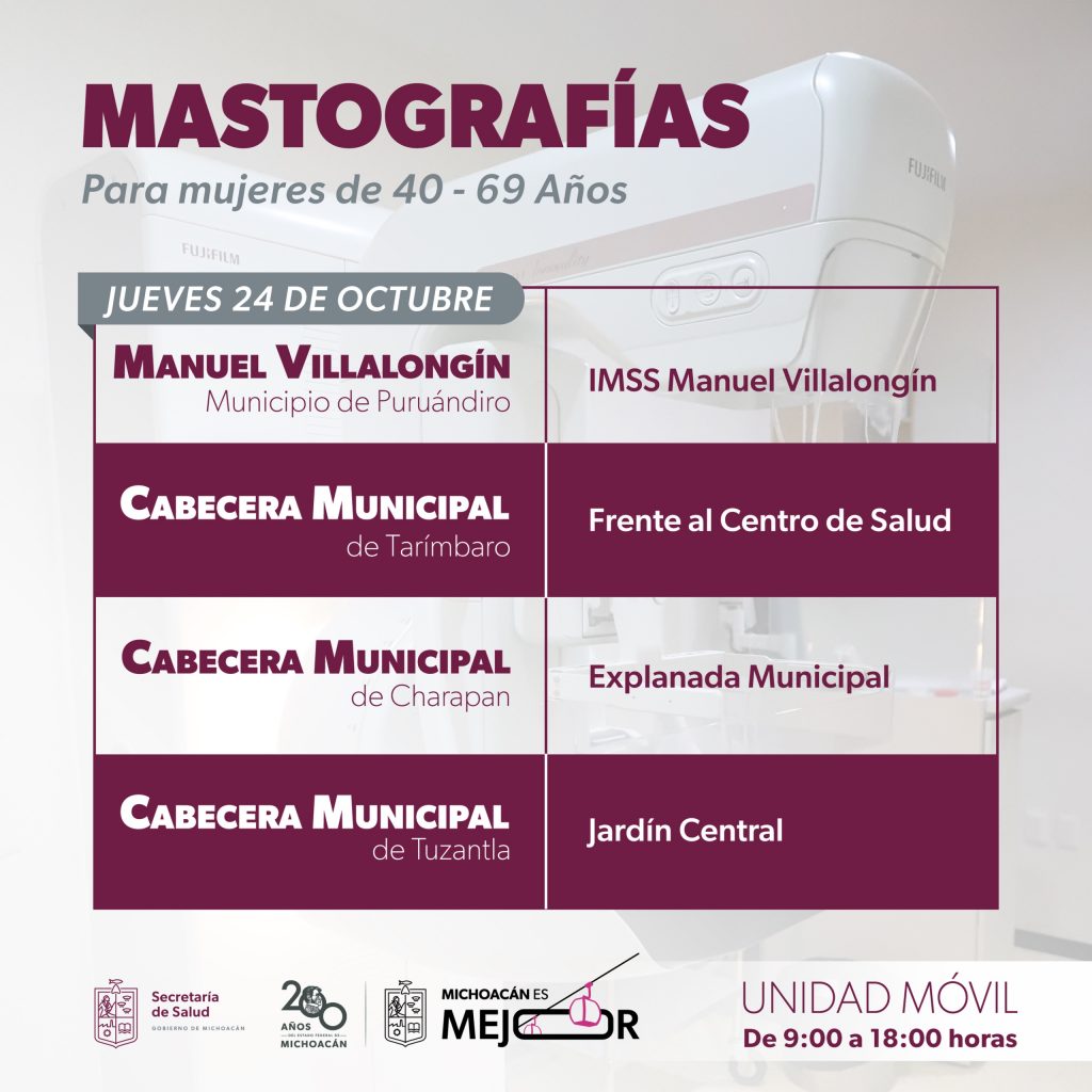 Este miércoles 23, las mastografías se realizarán en la Unidad de Medicina Rural del IMSS, en San José Huipana, municipio de José Sixto Verduzco; frente al centro de salud de Tarímbaro; en la explanada municipal de Charapan; y en el deportivo de Tlalpujahua.