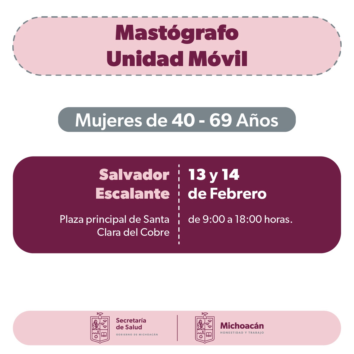 Morelia, Michoacán, 10 de febrero de 2023.- Con el propósito de brindar diagnósticos y tratamientos oportunos contra el cáncer de mama a mujeres de entre 40 a 69 años, la Secretaría de Salud de Michoacán (SSM) realizará una jornada de mastografía gratuita en el municipio de Salvador Escalante, los días 13 y 14 de febrero.