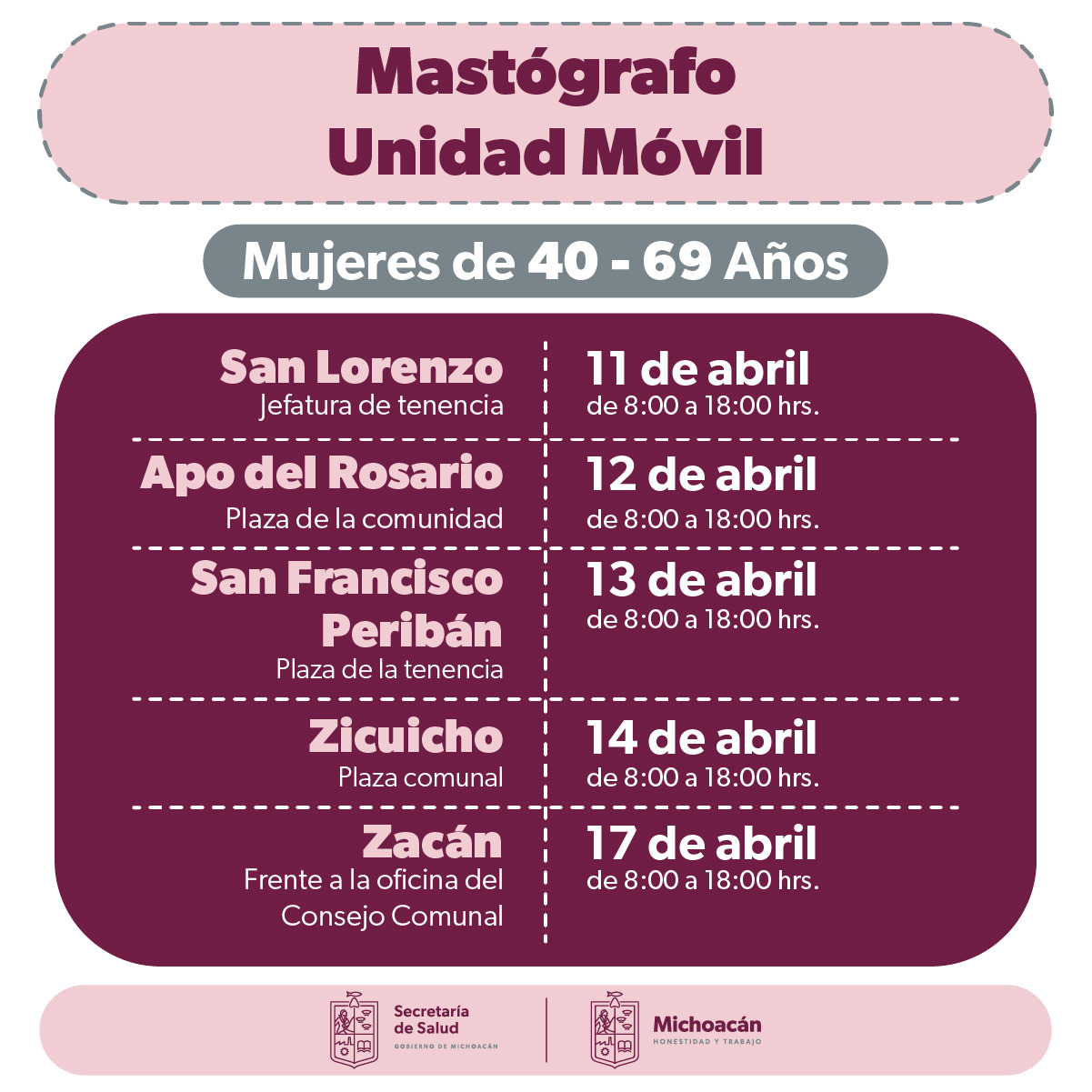 En Los Reyes, personal de la SSM llevará a cabo las mastografías el viernes 14 de abril en la plaza comunal de Zicuicho; mientras que el lunes 17 la jornada será frente a la oficina del Consejo Comunal de Zacán.