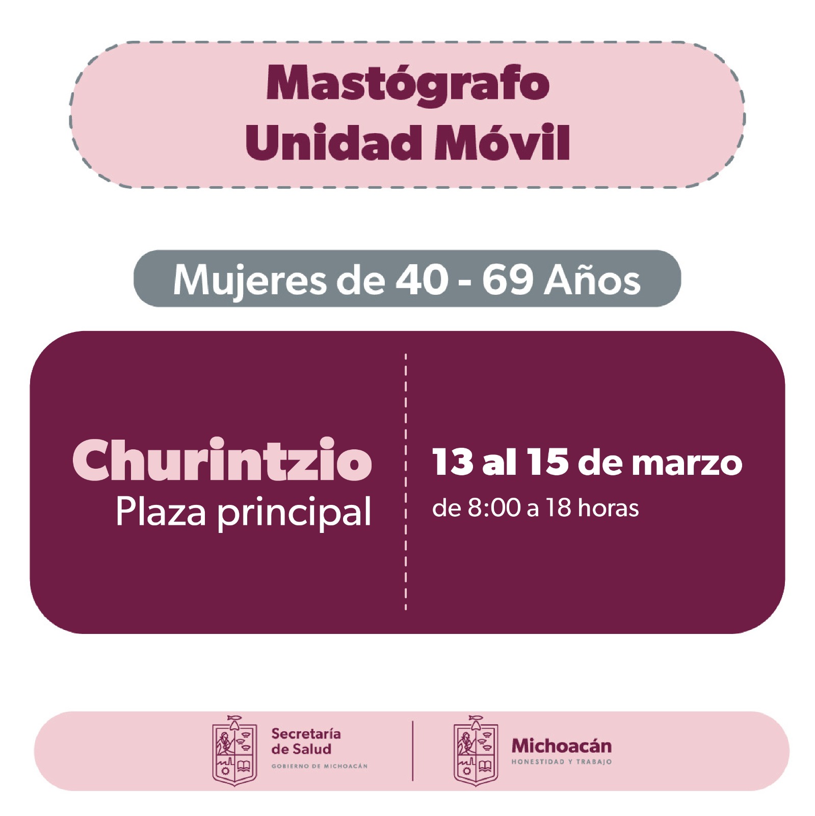 Morelia, Michoacán, 10 de marzo de 2023.- Del 13 a 15 de marzo, la Secretaría de Salud de Michoacán (SSM) llevará mastografías gratuitas a mujeres de entre 40 a 69 años de edad, en el municipio de Churintzio.