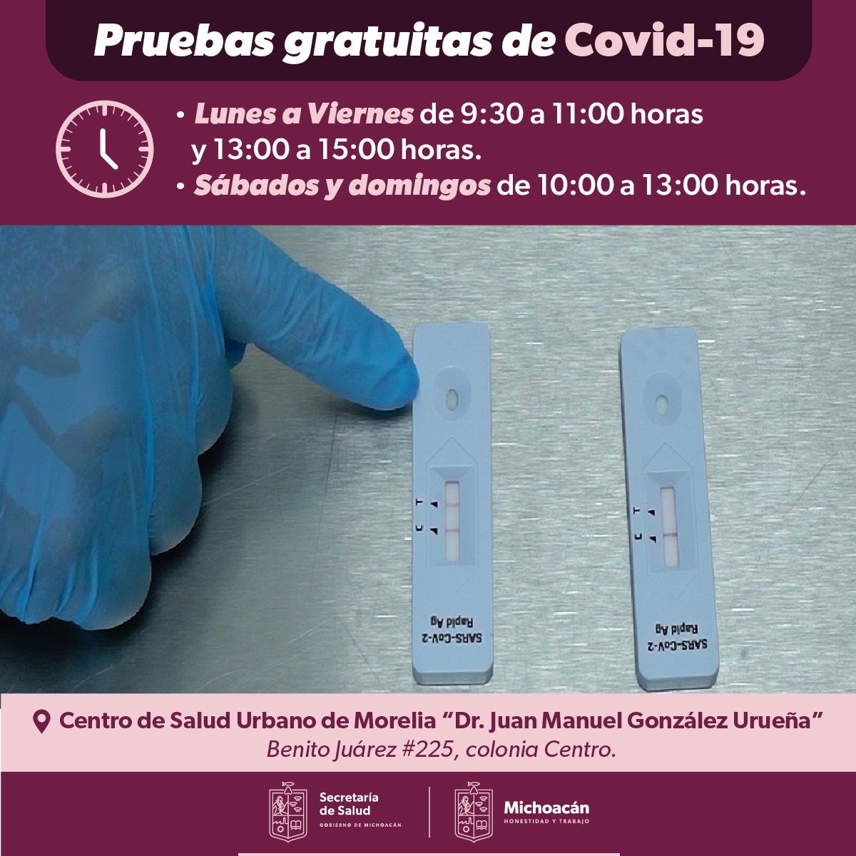 Morelia, Michoacán, 14 de abril de 2023.- La Secretaría de Salud de Michoacán (SSM) mantiene activo el servicio de pruebas gratuitas de COVID-19 en el Centro de Salud Urbano de Morelia Dr. Juan Manuel González Urueña, para brindar un diagnóstico y tratamiento oportuno a esta enfermedad.