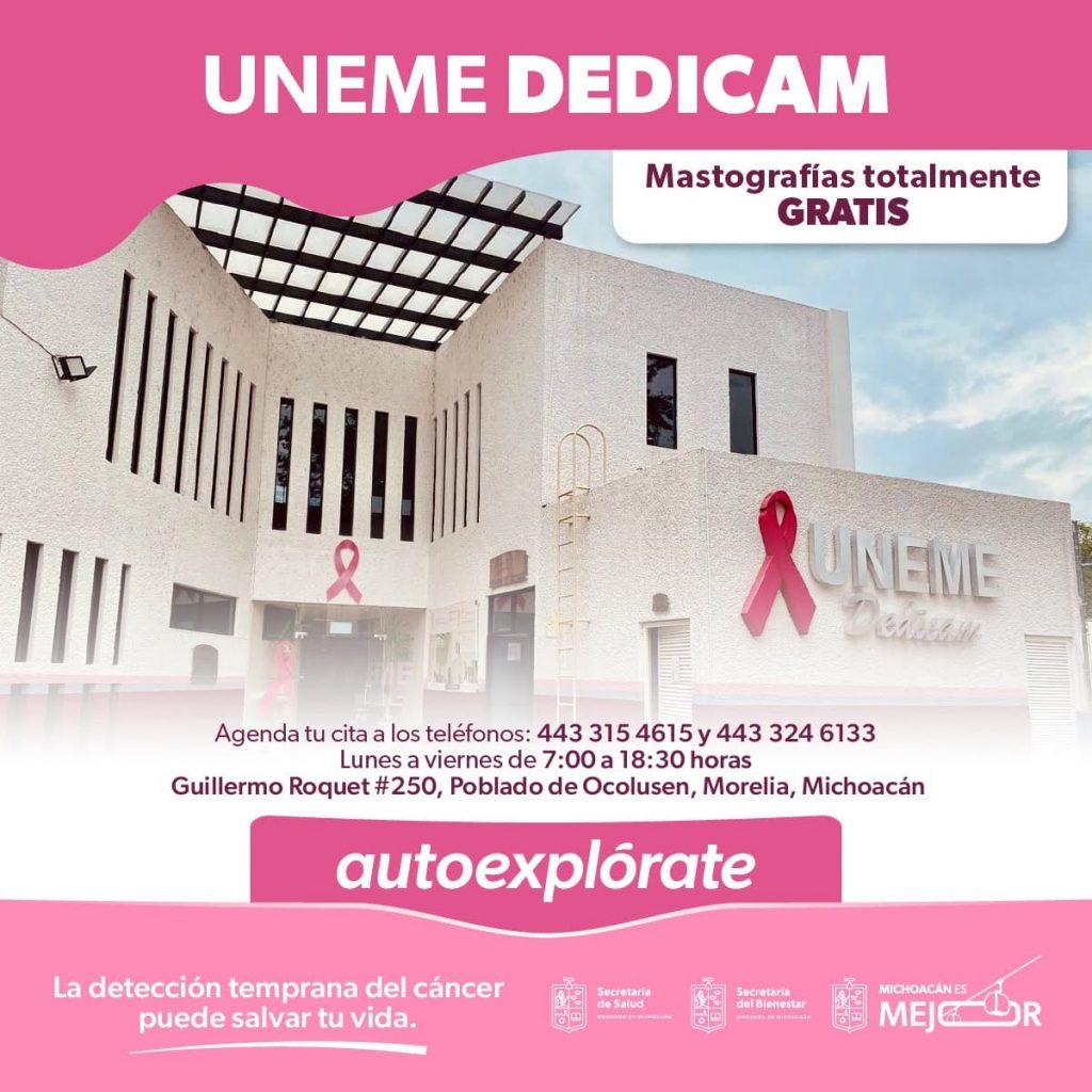 Las interesadas, puede acudir a cualquiera de las siete unidades fijas ubicadas en los Hospitales Generales “Dr. Miguel Silva, Zamora, Zitácuaro, Uruapan, de la Mujer, la Unidad de Especialidades Médicas para la detección temprana de cáncer de mama (Uneme Dedicam) y el Instituto Michoacano de Oncología.