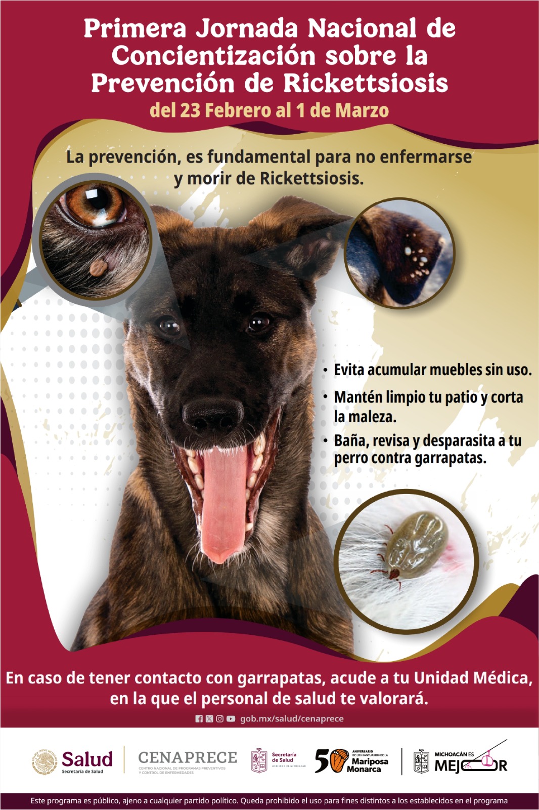 Morelia, Michoacán, 25 de febrero de 2025.- La Secretaría de Salud de Michoacán (SSM), se suma a la Primera Jornada Nacional de Concientización sobre la Prevención de rickettsiosis, que se lleva a cabo del 23 de febrero al 1 de marzo, con el objetivo de informar y sensibilizar a la población sobre esta enfermedad transmitida a través de una picadura.