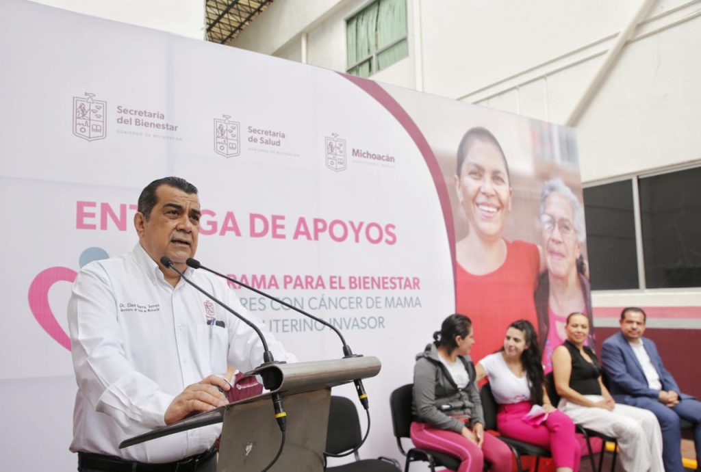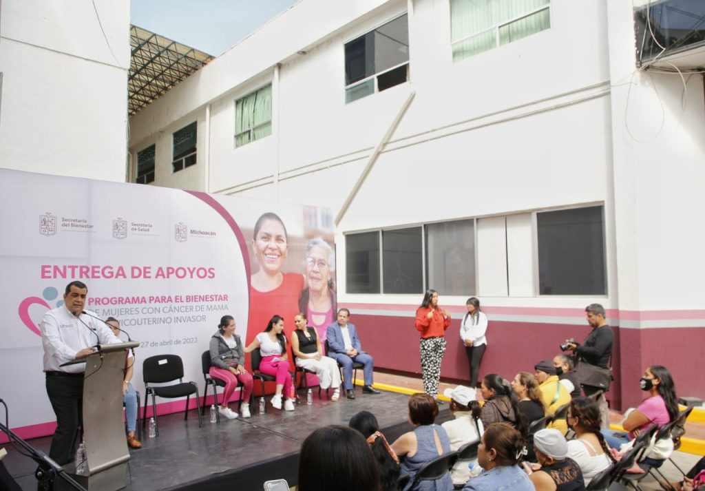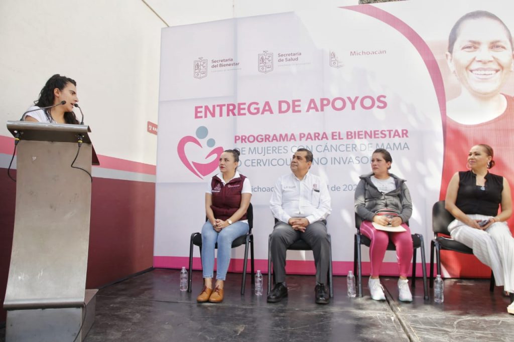Morelia, Michoacán, 27 de abril de 2023.- Con una erogación de 428 mil pesos, las secretarías de Bienestar (Sedebi) y de Salud (SSM), realizaron la primera entrega de recursos del Programa Mujeres con Cáncer de Mama y/o Cervicouterino Invasor, a 107 beneficiarias de 40 municipios del estado.