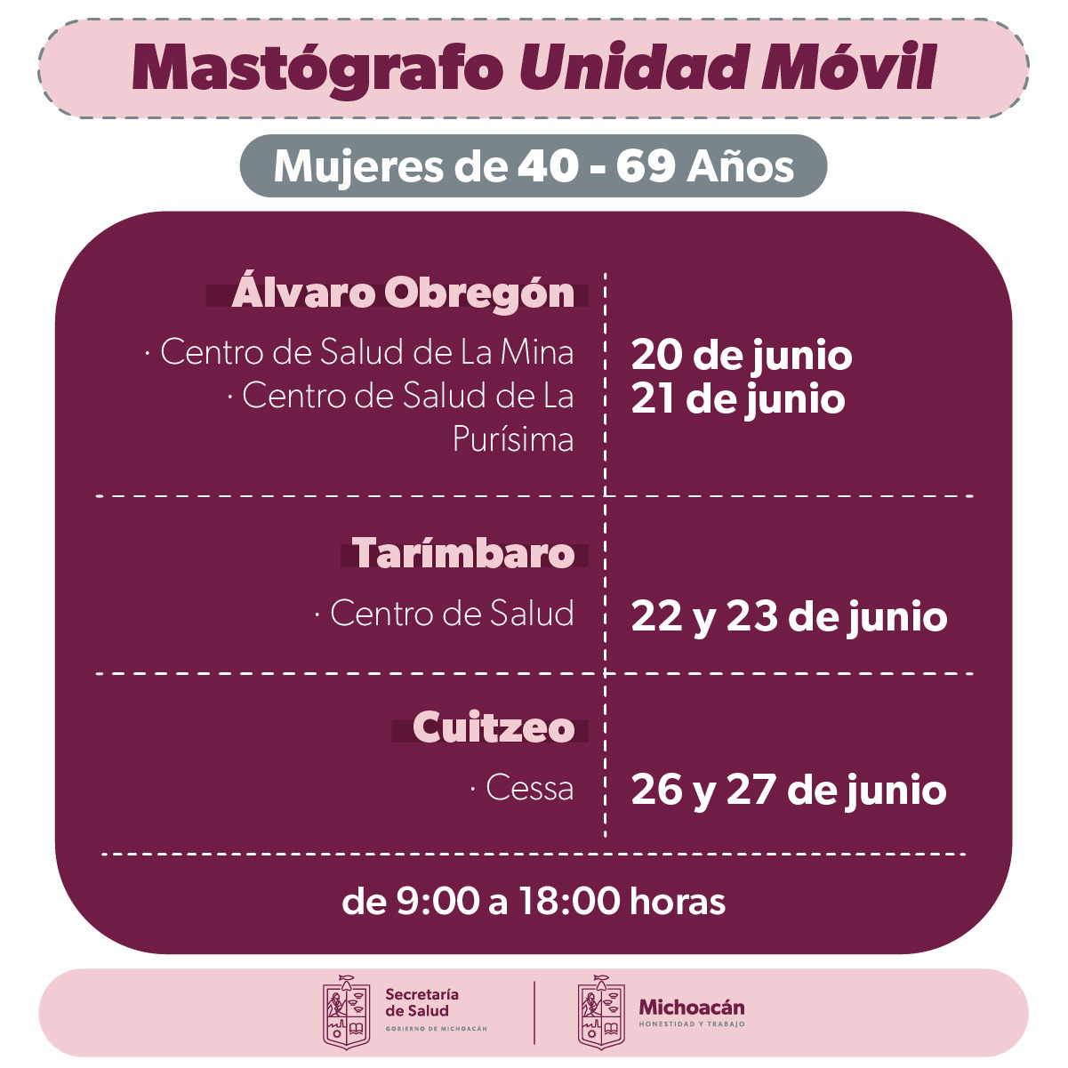 Morelia, Michoacán, 19 de junio de 2023.- El cáncer de mamá es una enfermedad curable en etapas tempranas, es por ello que la Secretaría de Salud de Michoacán (SSM) llevará mastografías gratuitas a mujeres de 40 a 69 años de edad, en los municipios de Álvaro Obregón, Tarímbaro y Cuitzeo, del 20 al 27 de junio.