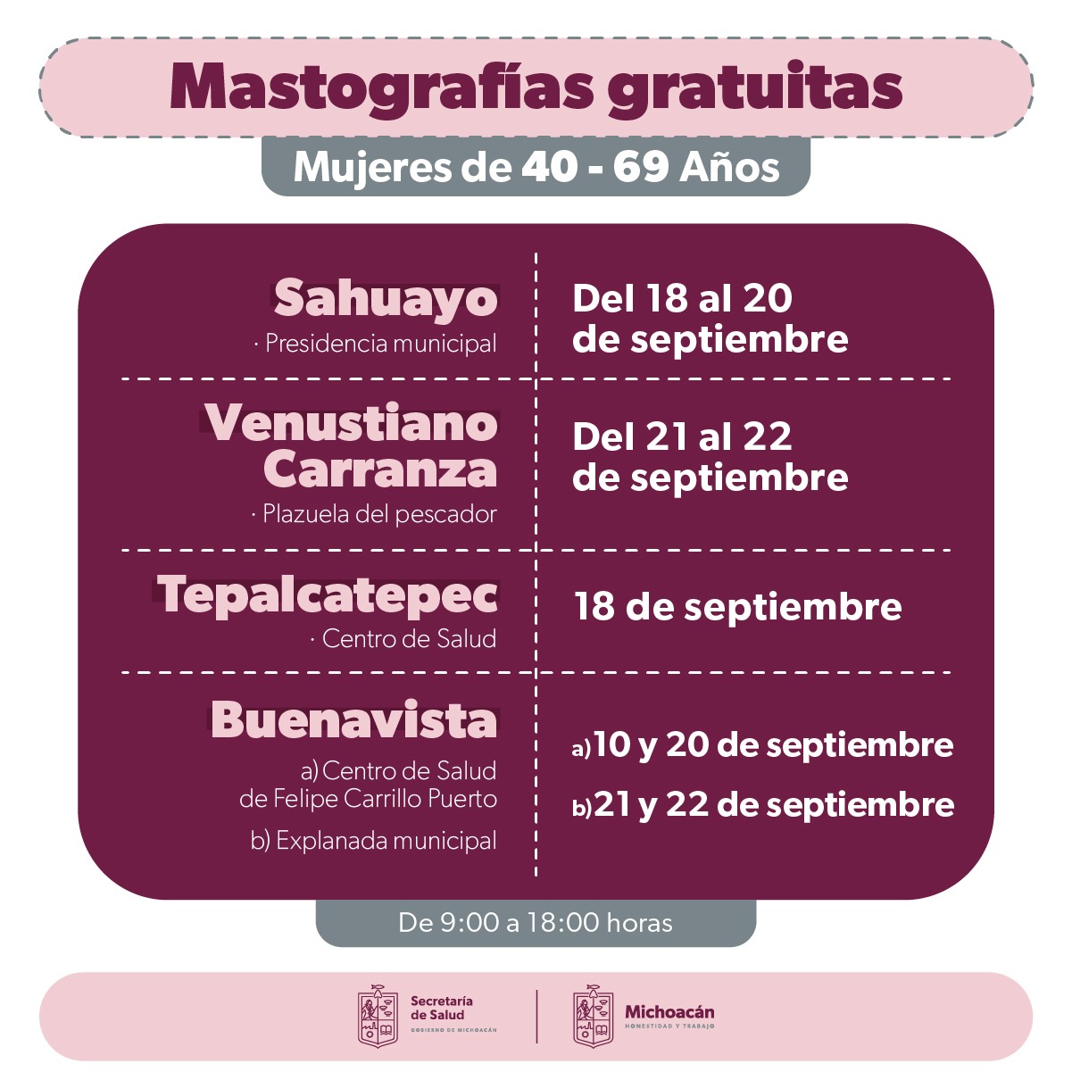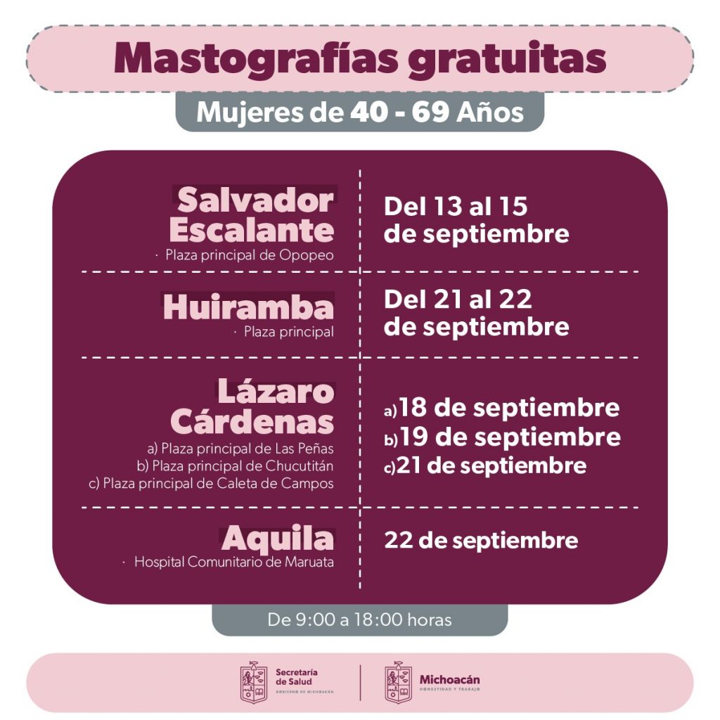 La primera fase de estudios gratuitos se llevará a cabo del 18 al 20 de septiembre en la presidencia municipal de Sahuayo, donde las pacientes podrán ser atendidas de 09:00 a 18:00 horas. En Venustiano Carranza, la sede será la plazuela del Pescador, los días jueves 21 y viernes 22 de septiembre.