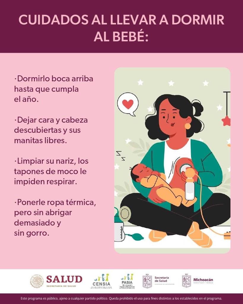 Morelia, Michoacán, 26 de septiembre de 2023.- La Secretaría de Salud de Michoacán (SSM) exhorta a madres y padres de familia a adoptar medidas preventivas para reducir hasta en un 50 por ciento las defunciones en menores de un año debido al síndrome de muerte súbita del lactante.