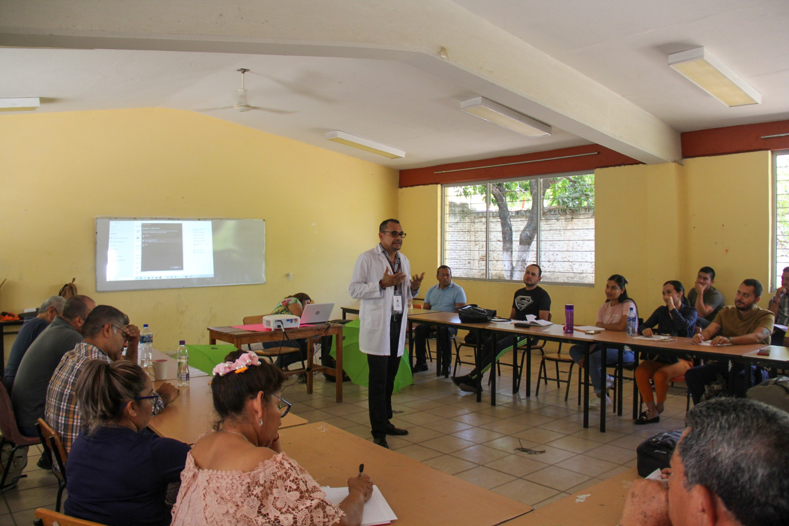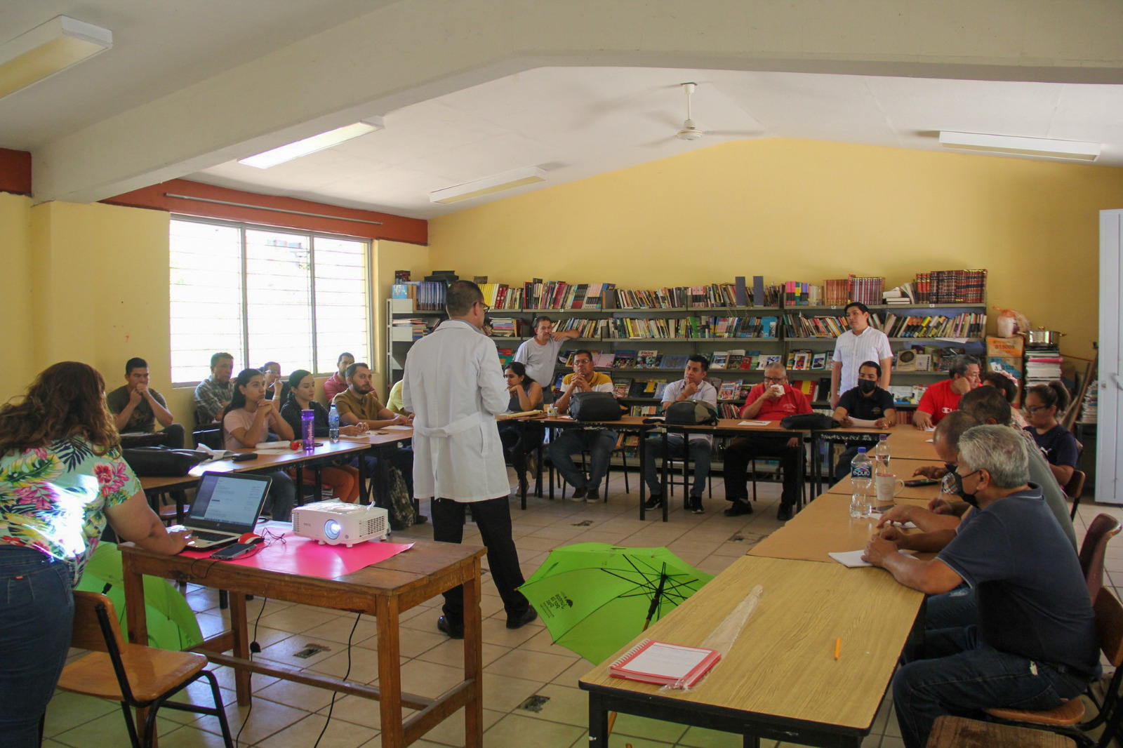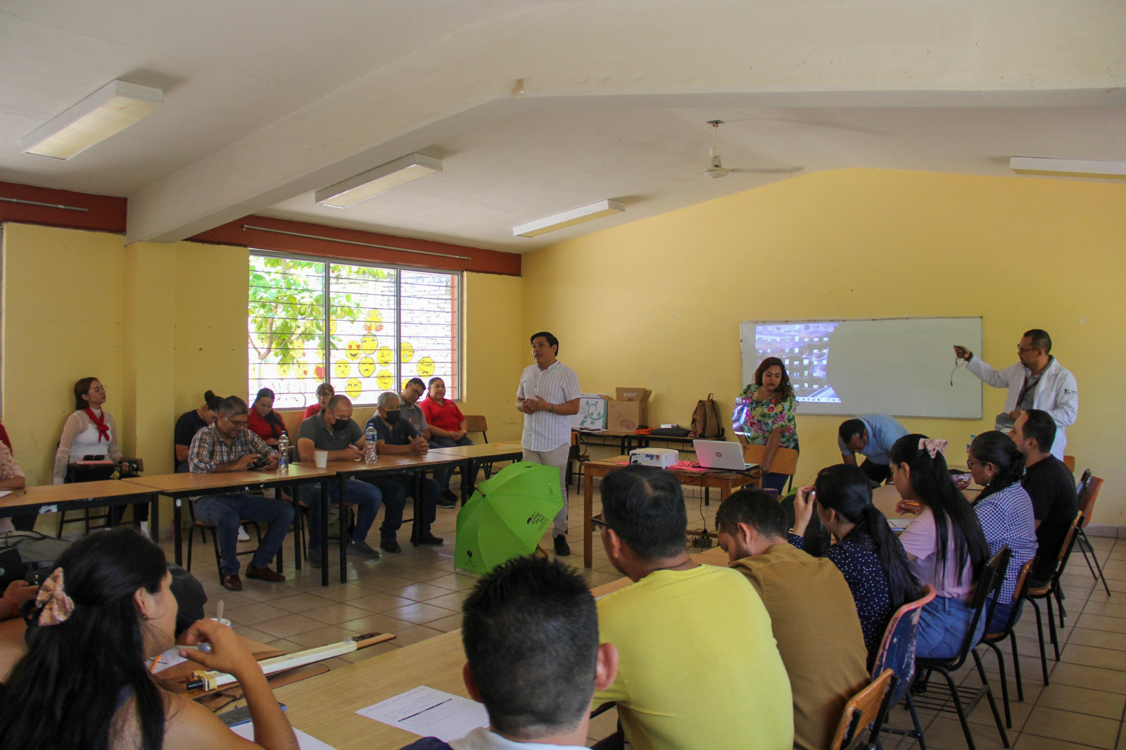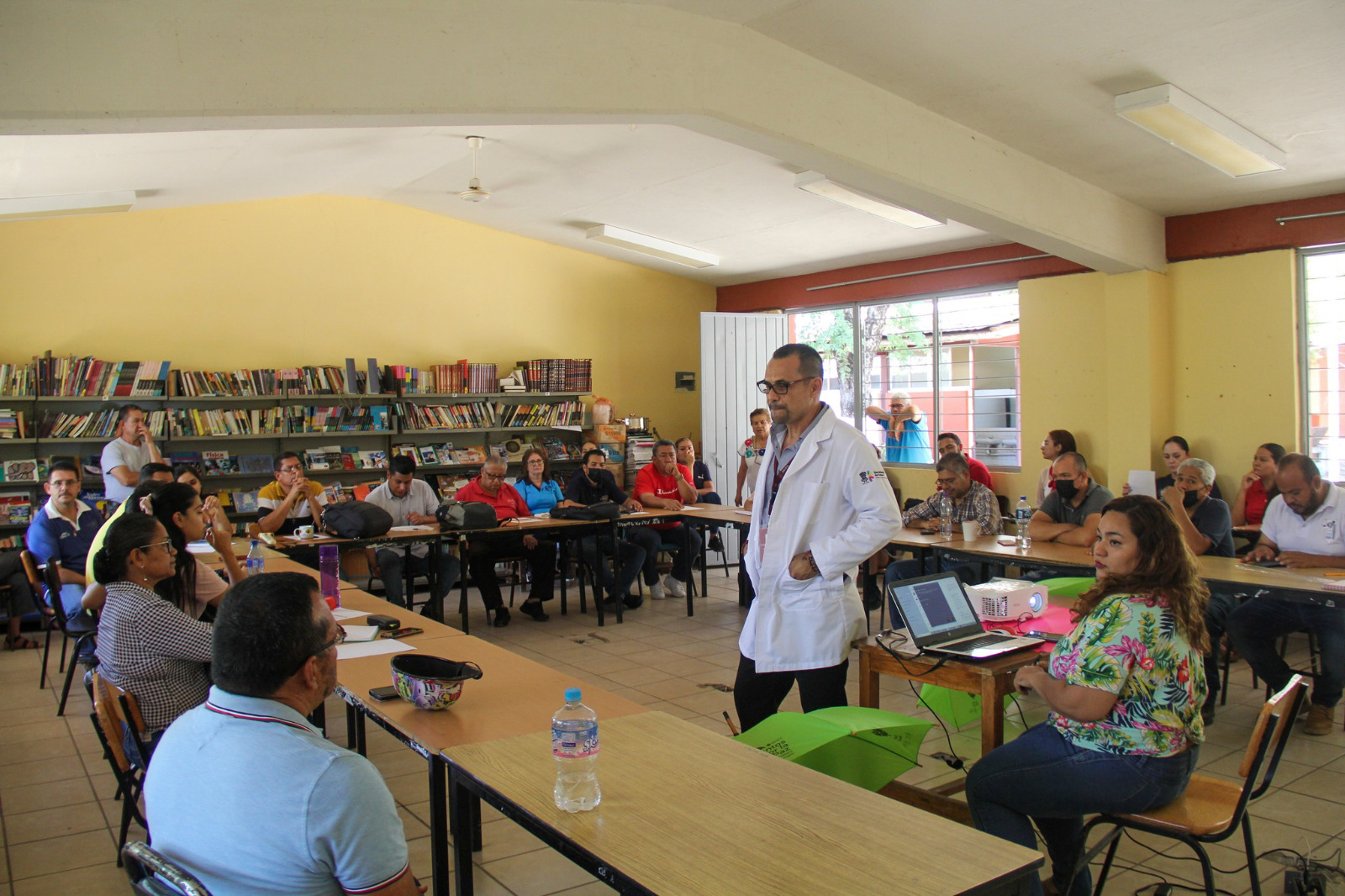 Apatzingán, Michoacán, 27 de abril de 2023.- Personal de la Jurisdicción Sanitaria de Apatzingán de la Secretaría de Salud de Michoacán (SSM), realizó un foro para sensibilizar en la prevención del suicidio y las adicciones al personal docente de la Escuela Secundaria Técnica 16.