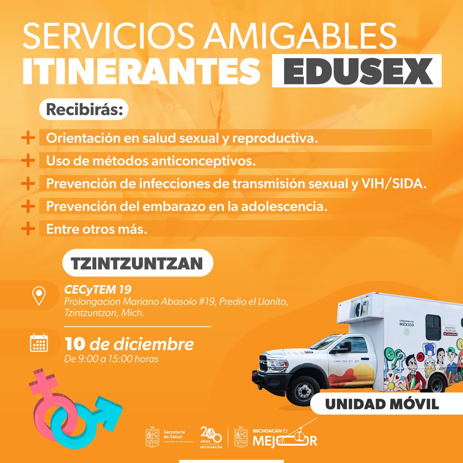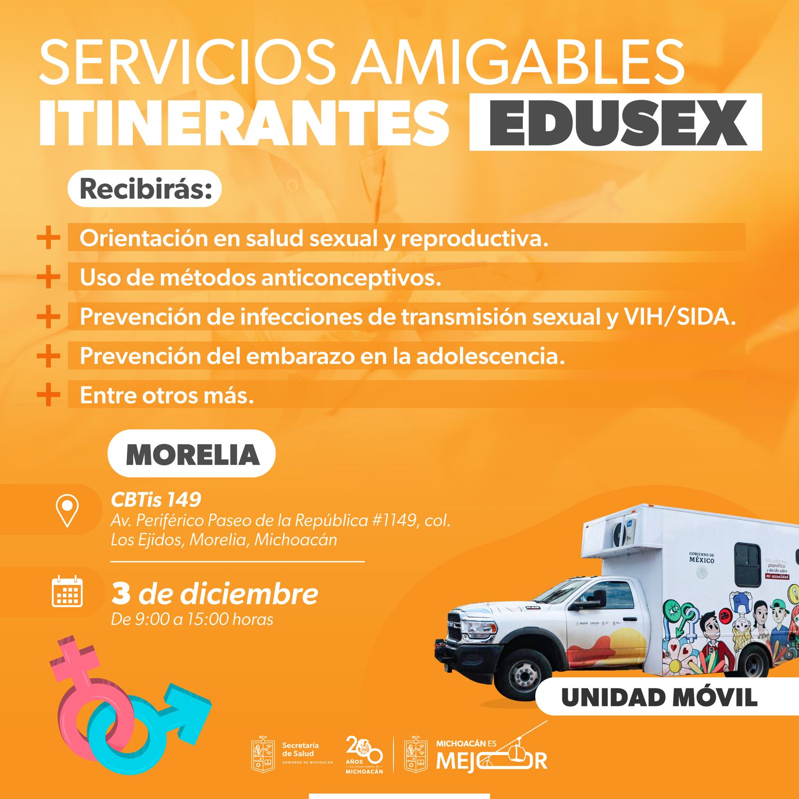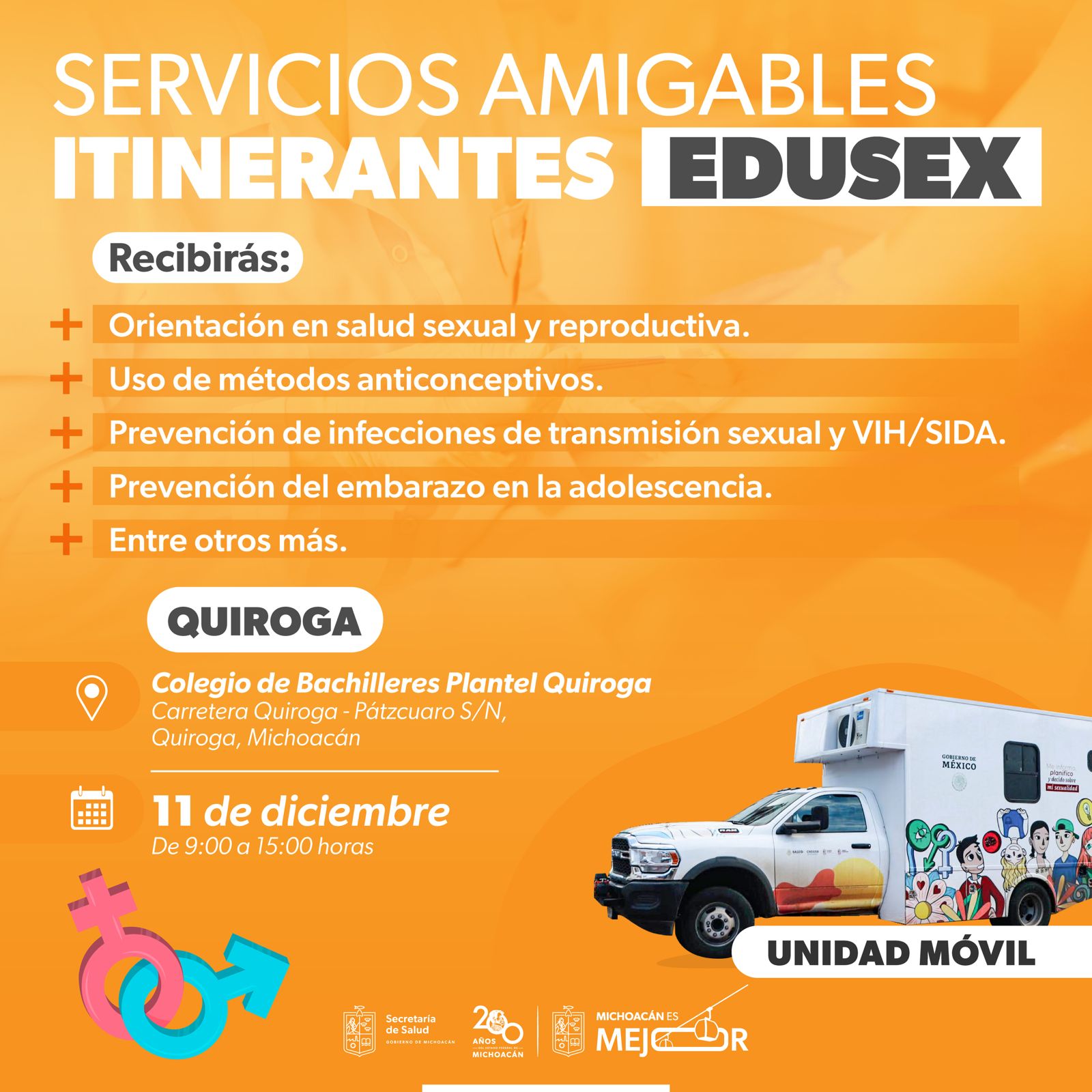 En Morelia, el servicio se otorgará de forma gratuita el 3 de diciembre en el CBTIS 149 y el 4 de diciembre en el CETIS 120; mientras que Tzintzuntzan, el 10 de diciembre en el Cecytem 19, el 11 de diciembre en el Colegio de Bachilleres, plantel Quiroga. Todos de 9:00 a 15:00 horas.