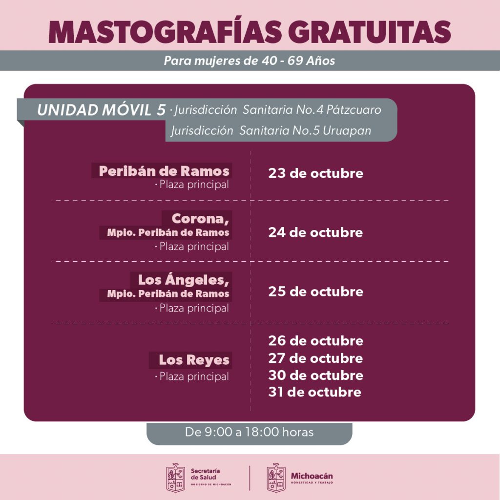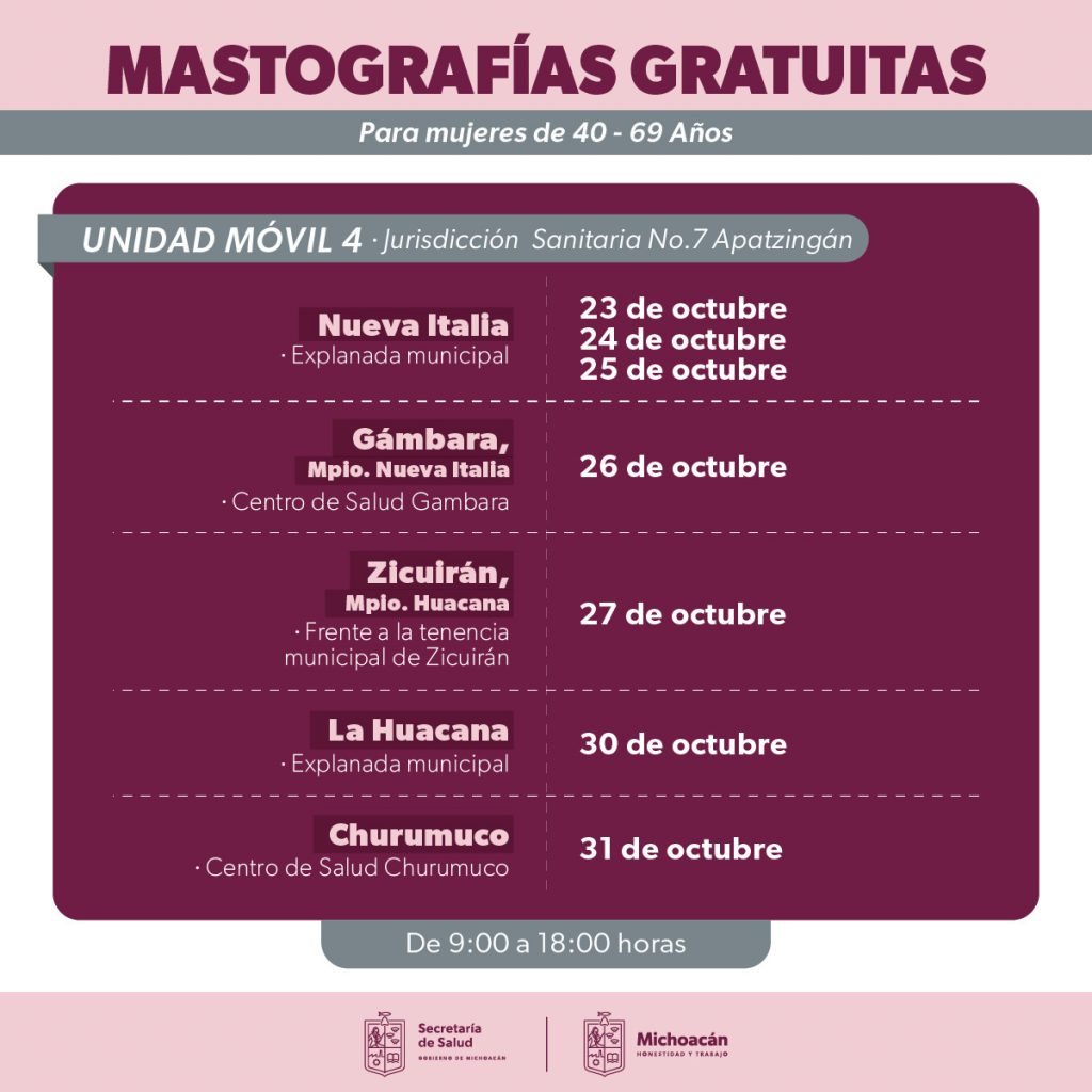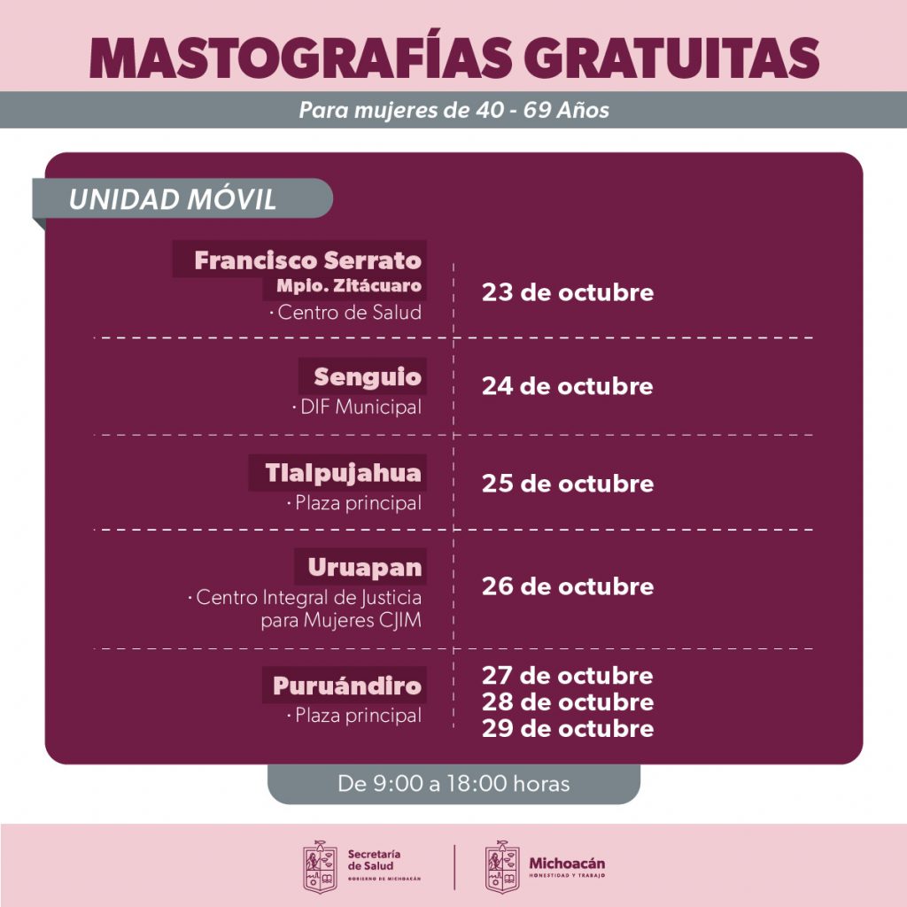 Morelia, Michoacán, 23 de octubre de 2023.– A partir de este lunes y hasta que concluya el mes de octubre, la Secretaría de Salud de Michoacán (SSM) instalará unidades móviles de mastografía en 19 municipios del estado.