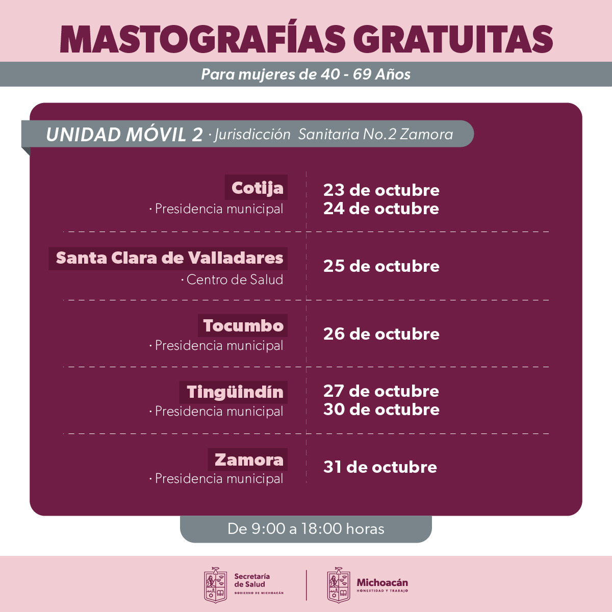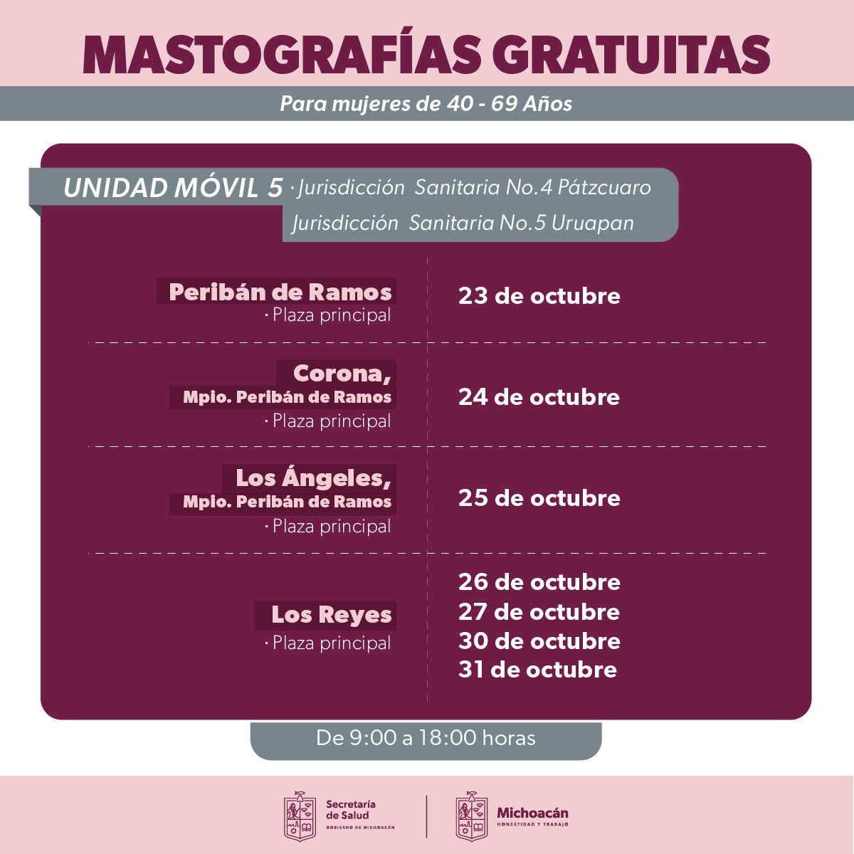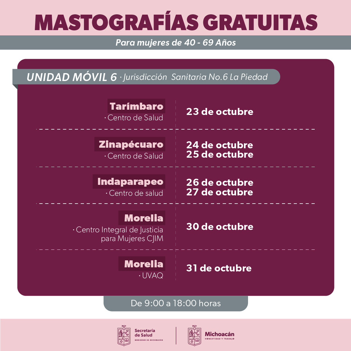Morelia, Michoacán, 23 de octubre de 2023.– A partir de este lunes y hasta que concluya el mes de octubre, la Secretaría de Salud de Michoacán (SSM) instalará unidades móviles de mastografía en 19 municipios del estado.