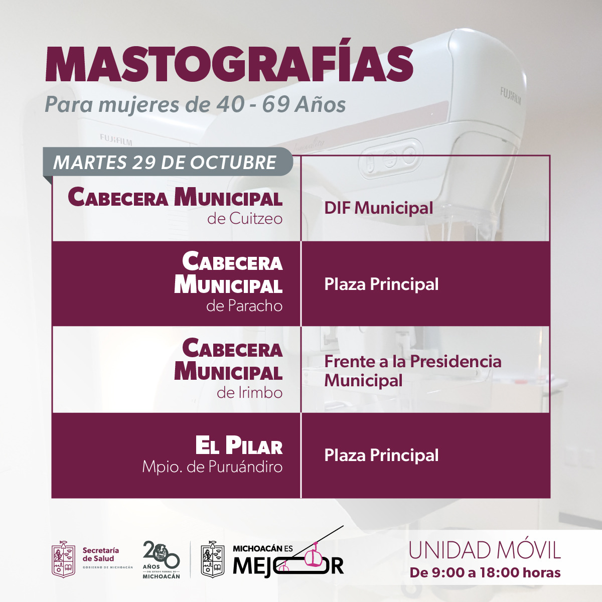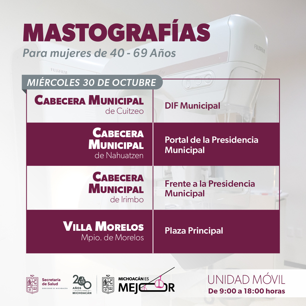 Morelia, Michoacán, 27 de octubre de 2024.- La Secretaría de Salud de Michoacán (SSM) cierra el mes de octubre con mastografías gratuitas en 10 municipios a través de sus cuatro unidades móviles.