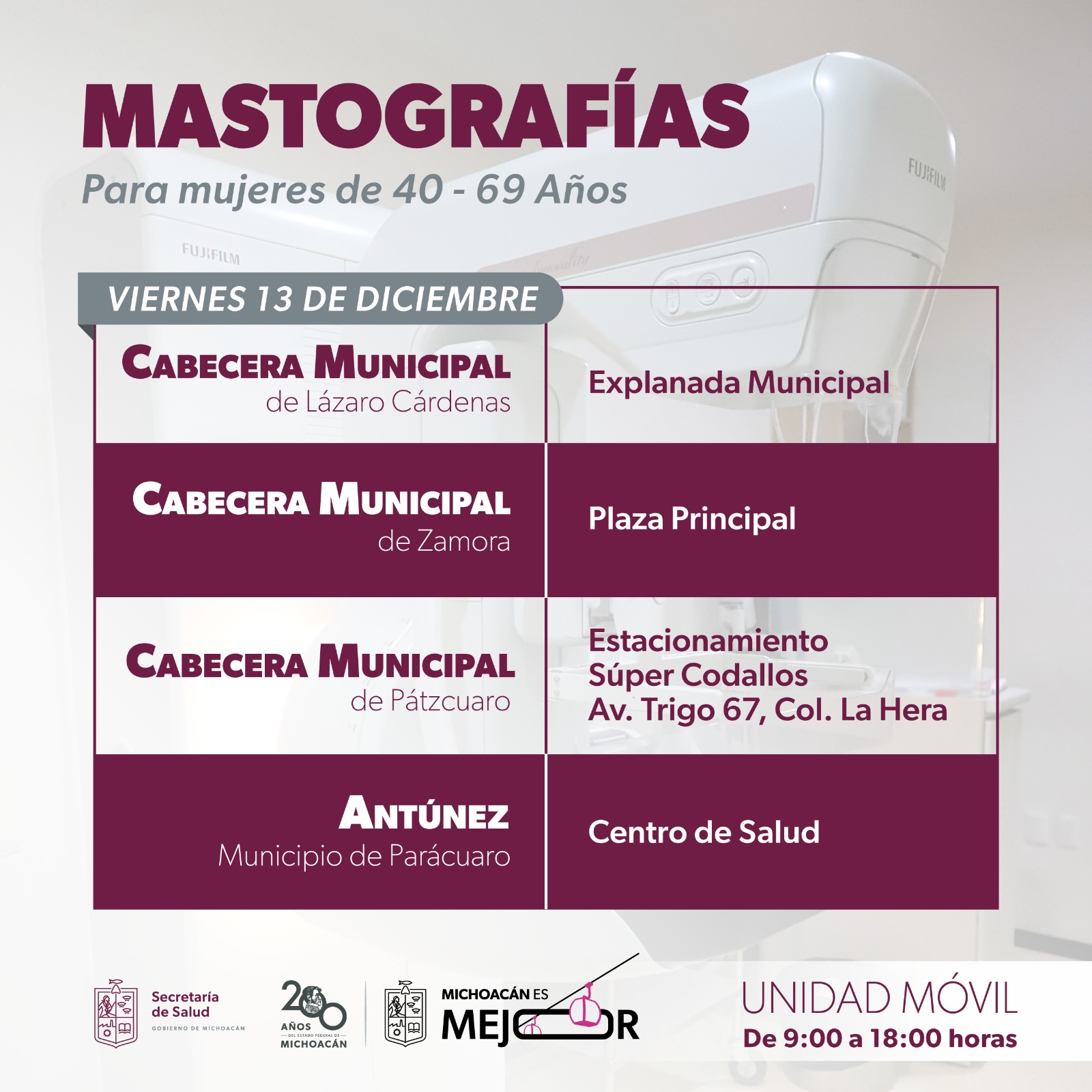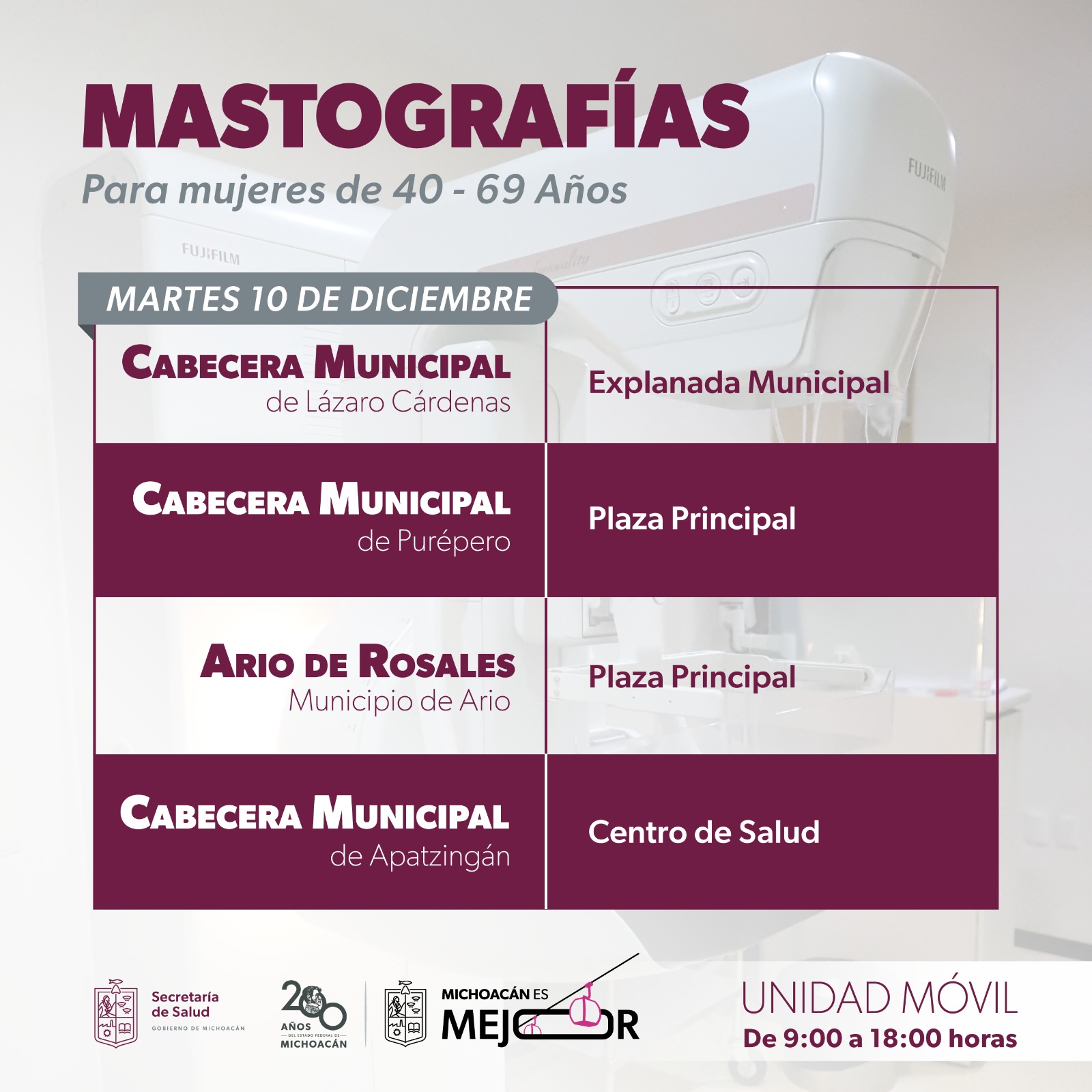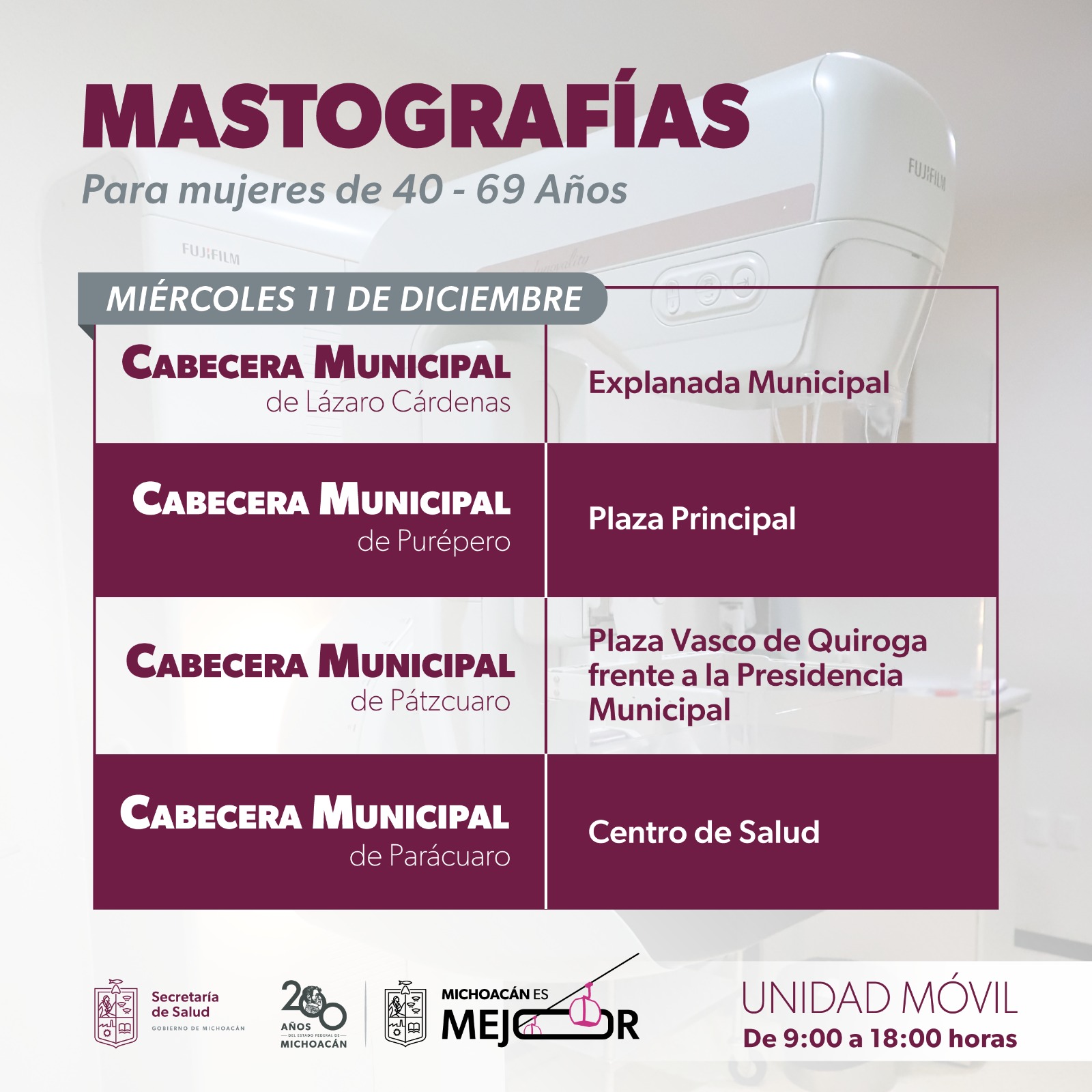 El día 9 de diciembre se realizarán los estudios gratuitos a mujeres de 40 a 69 años en la plaza principal de Carapan, municipio de Chilchota y en Santa Clara del Cobre, perteneciente a Salvador Escalante; además de las cabeceras municipales de Lázaro Cárdenas (explanada) y Apatzingán (centro de salud).
