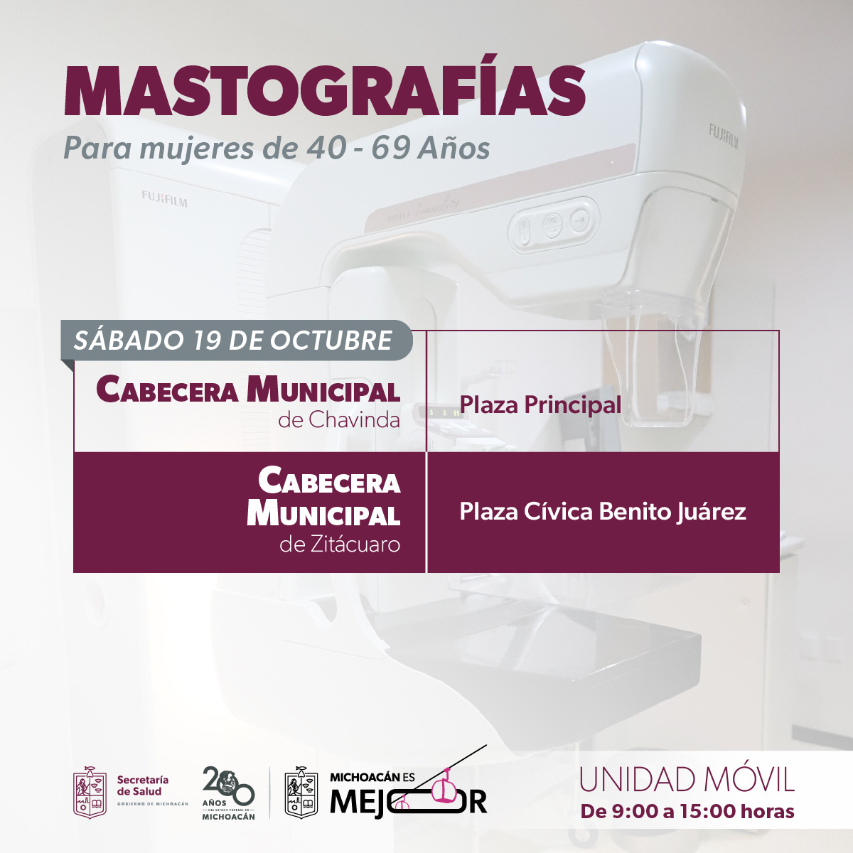 Los estudios se harán en unidades móviles equipadas con mastógrafos, con capacidad para atender hasta 120 usuarias por día, en horario de 9:00 a 15:00 horas. El sábado 19, los servicios estarán disponibles en la plaza cívica Benito Juárez de Zitácuaro y en la plaza principal de Chavinda.