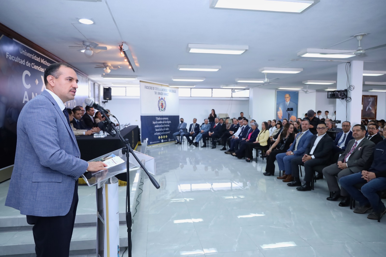 El secretario de Salud de Michoacán, Lázaro Cortés Rangel, encabezó el acto conmemorativo en donde hizo extensiva la felicitación a los más de 3 mil médicas y médicos, especialistas, epidemiólogos, sanitaristas, pediatras, ginecólogos, ortopedistas, cirujanos, oncólogos y neurólogos que laboran en la dependencia estatal, así como a los 526 profesionales de la salud, que egresan cada año de la Facultad de Medicina Dr. Ignacio Chávez.