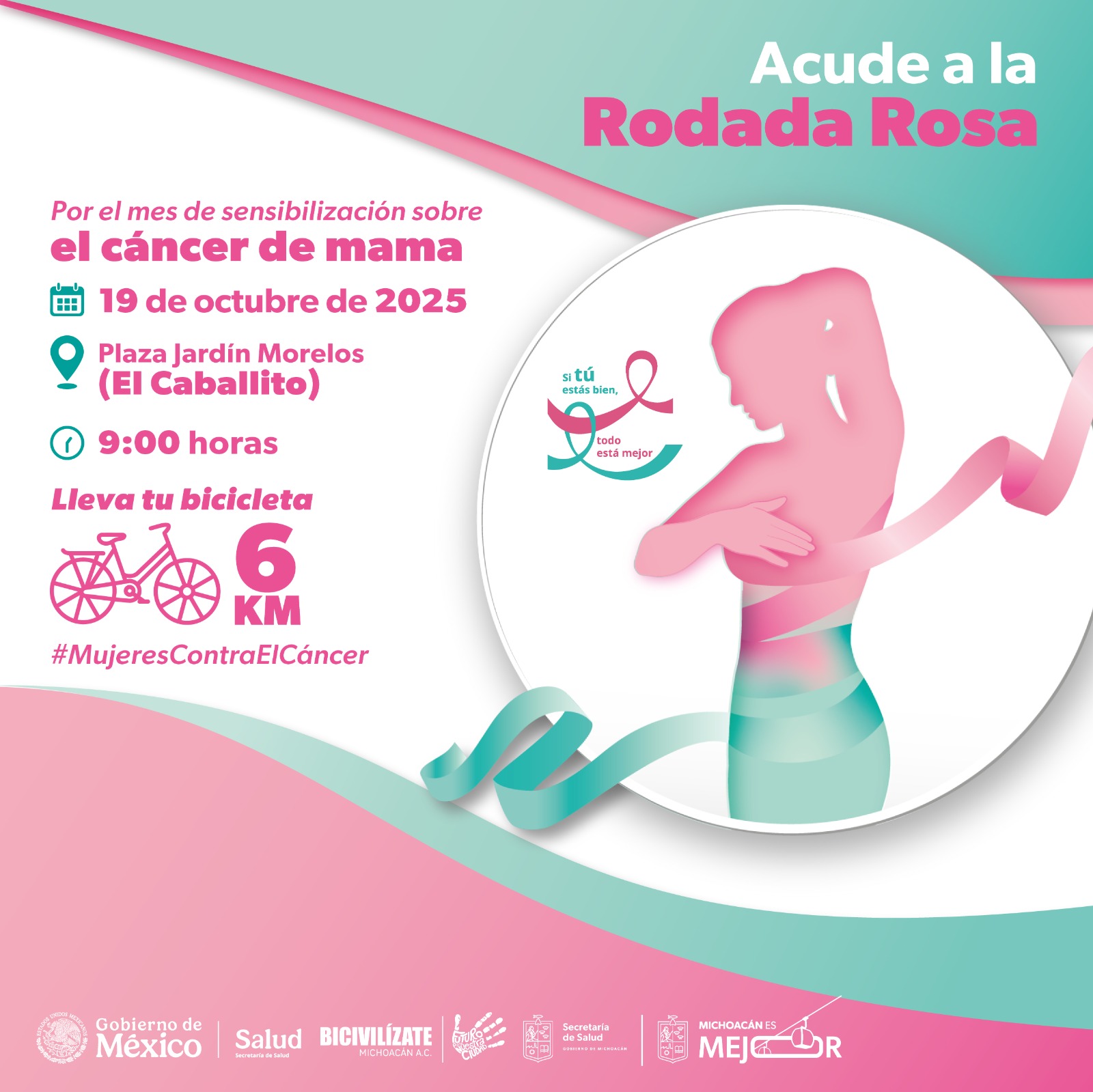 Morelia, Michoacán, 18 de octubre de 2025.- En el marco del Día Mundial contra el Cáncer de Mama, la Secretaría de Salud de Michoacán (SSM) convoca a participar en la rodada rosa y en la Feria de la Salud Integral que se llevarán a cabo el 19 de octubre.